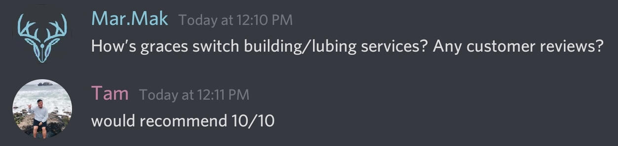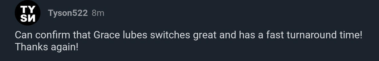 Hello! My name is Grace, but you also may know me as zer0u or butterflysnest. I'm located in Washington State (The NW one, not the one with the President) with my 2 cats, Hera and Luna.I've been lubing switches for friends but as I meet more and more people who either don't have the time or patience (or even the right tools) to lube their own switches I figured I should offer this service to everyone!