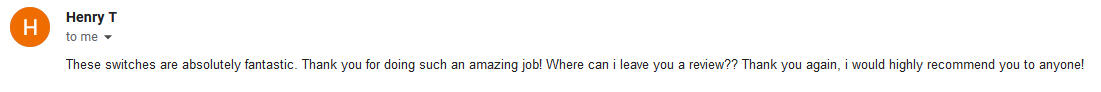 1. Fill Out the form by clicking the "Service Request Form" button below.2. Within 48 hours I'll email you back with answers to any questions, and mailing/drop off instructions.3. Reply back with tracking number/intent to mail switches in within 3 weeks. (If I do not receive the tracking within 3 weeks your order will be canceled. If switches arrive after that 3 weeks, without a tracking number sent to me, I will have them returned to sender.)4. When the switches come in I'll email you again to let you know, and give you an estimated completion time. At this time I will also ask for your mailing address so that I can send an invoice as soon as your switches are finished.5. I will send a paypal invoice for your total including shipping back to you, and email you to let you know they have been completed.6. Once the invoice has been paid I will ship within 48 hours and you will receive an email with your tracking number.
